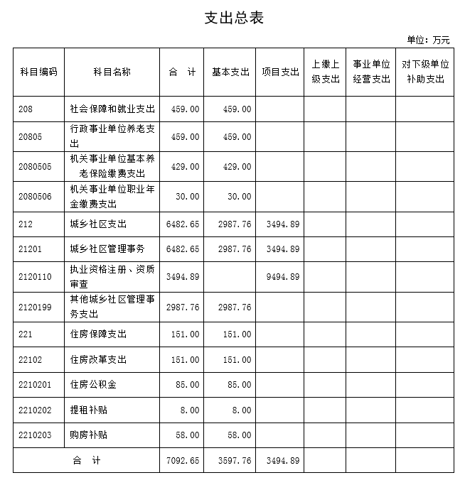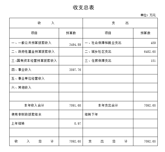 注册中心2021年收支总预算7092.65万元,所有收入和支出均纳入部门预算管理。收入包括:一般公共预算拨款收入3494.89万元、事业收入3597.76万元、上年结转0.97万元。支出包括:社会保障和就业支出459万元、城乡社区支出6482.65万元、住房保障支出151万元。