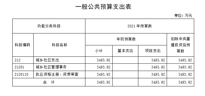 城乡社区支出(类)城乡社区管理事务(款)执业资格注册、资质审查(项)2021年预算数3493.92万元,主要用于组织开展一级建造师、注册建筑师、勘察设计注册工程师、注册房地产估价师的考试、注册工作,以及注册监理工程师的注册等工作。