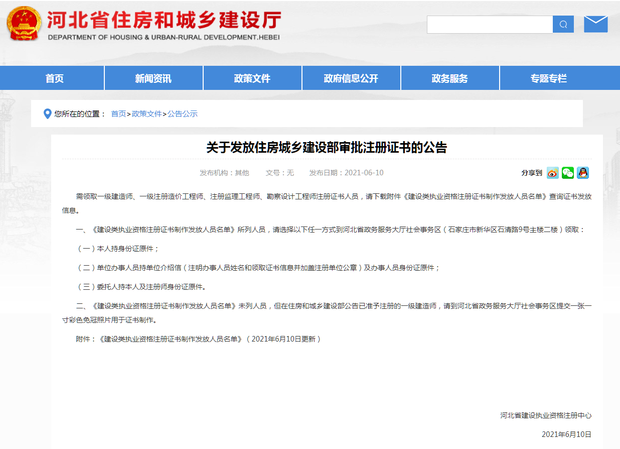 昨日河北住建厅发布:关于发放住房城乡建设部审批注册证书的公告